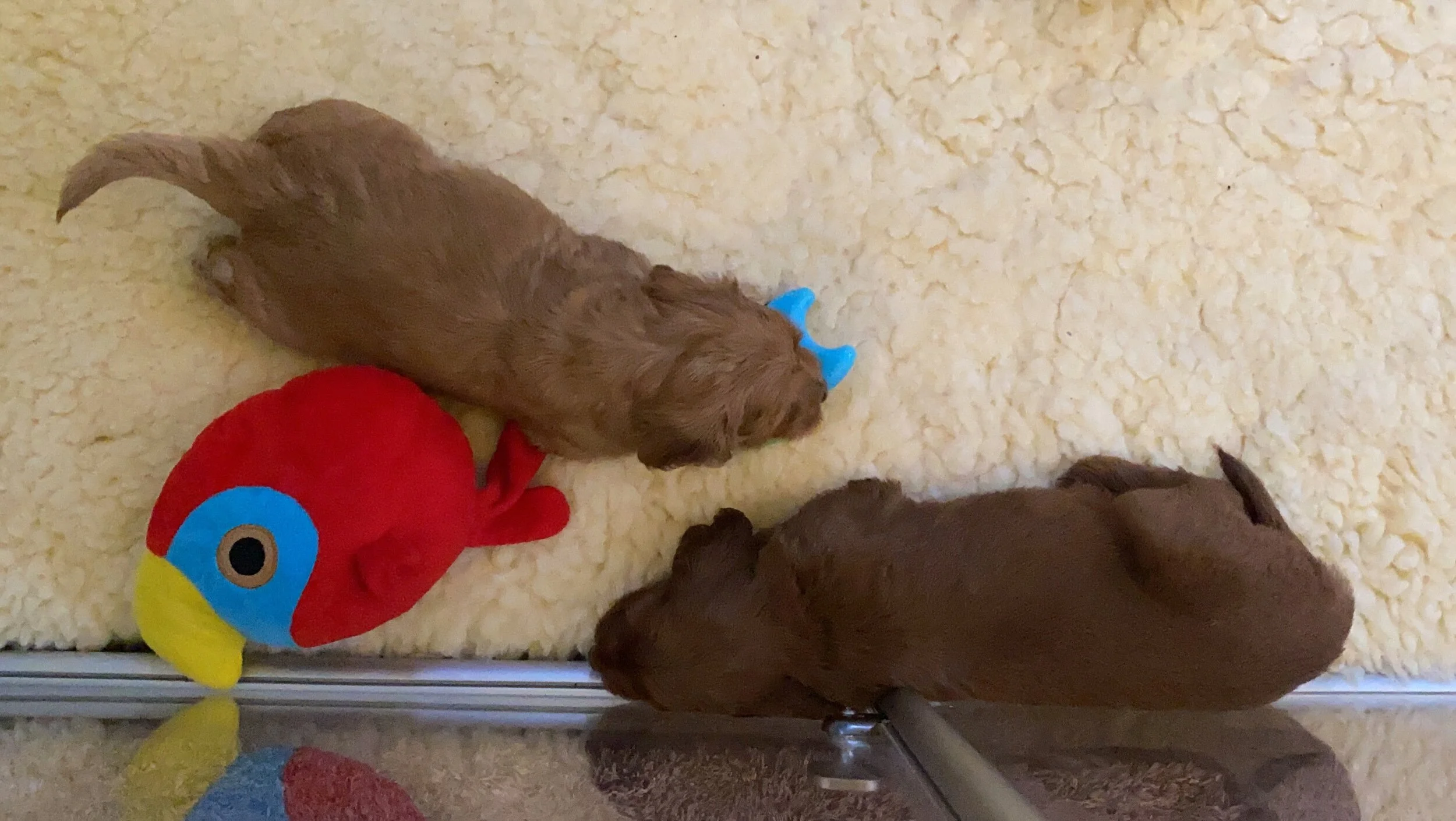 When the puppies were two weeks old they got a new floor. They were confused at first by the similarity between the fleece and their mom but were soon set straight.