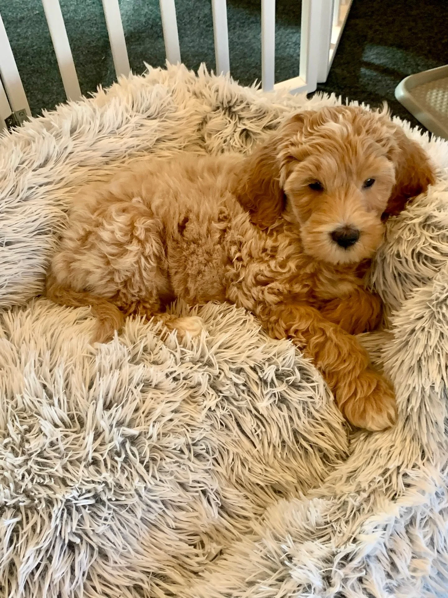 Australian Labradoodles are a delight to live with. Many people who are allergic to dogs can have an Australian Labradoodle. Not only are they intelligent, but they are also very funny. With their floppy ears, wide-set eyes and wavy or curly coats, they can look like muppets. When introducing them, we like to tell people that "yes, they are as silly as they look." They will put on a sudden burst of speed, something Australian Labradoodle owners call "zoomies" which is both fun to watch and helpful in getting them to rest. While resting they can assume what we call the "attack position" where their bellies are exposed, legs splayed out and tongue hanging out of their head that's lying on the ground. Australian Labradoodles are in love with the dishwasher. Anytime we are loading it they will be waiting to inspect everything that goes in.